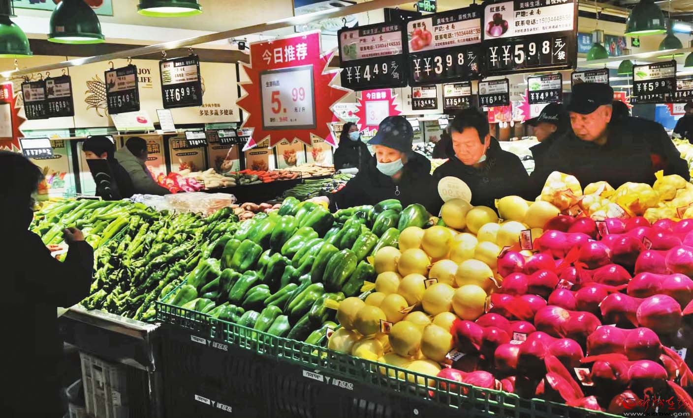 春節(jié)臨近,各大年貨市集購銷兩旺,人們忙著采購年貨,處處彌漫著年味兒。圖為市民在家家利超市選購蔬菜。 (