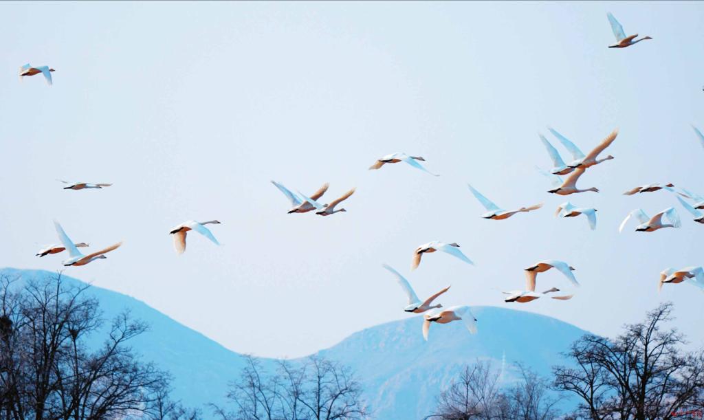 在忻府區(qū)永豐莊,成群結(jié)隊(duì)的天鵝舒展著潔白的羽翼在天空翱翔,或引吭高歌,或盤旋飛舞,與周圍的田野、藍(lán)天構(gòu)成了一幅和諧而靈動(dòng)的唯美畫卷。 (張 鵬攝)
