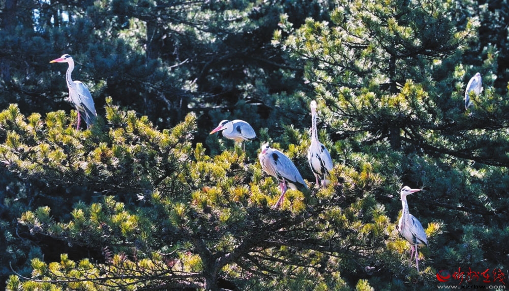 蒼鷺筑巢頗為講究,專挑高大樹木頂端,細(xì)樹枝橫豎交錯搭成盆狀。鎮(zhèn)海寺及周邊有530株樹齡在150—1000年的油松,入選“全國100個最美古樹群”,是蒼鷺理想的棲息地。一年又一年,不斷有雛鳥在“咯咯”的啼叫聲中平安長大,蒼鷺家族由最初的幾只壯大到了現(xiàn)在的上百只。