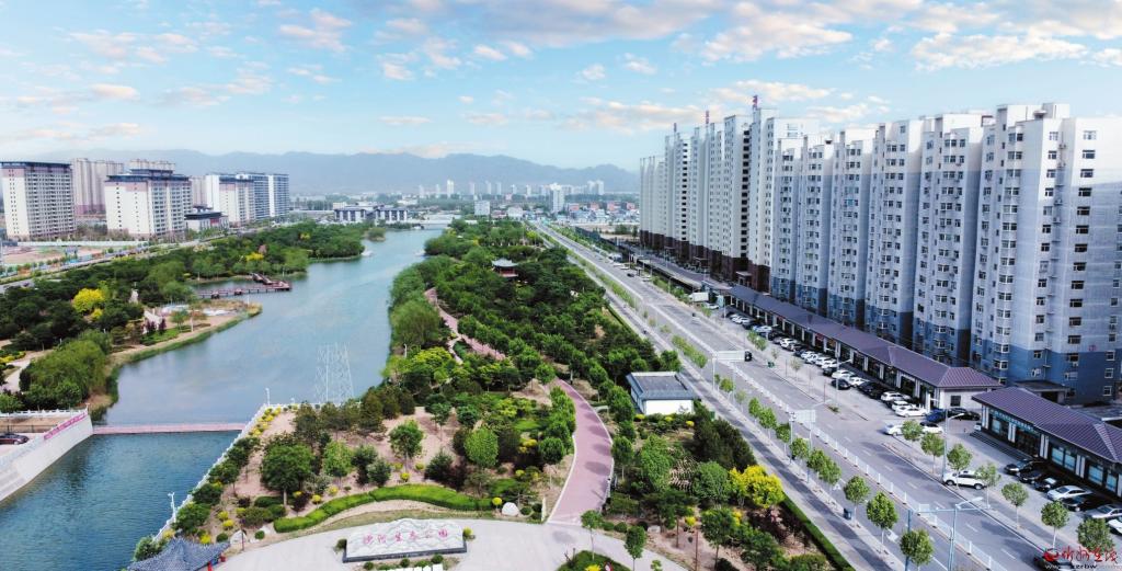 初夏時節(jié),原平城區(qū)沙河生態(tài)公園內(nèi)草木蔥蘢,與藍(lán)天白云、城市建筑構(gòu)成一幅水清、岸綠、景美的城市生態(tài)畫卷。圖為沙河生態(tài)公園一角。(褚震 攝)