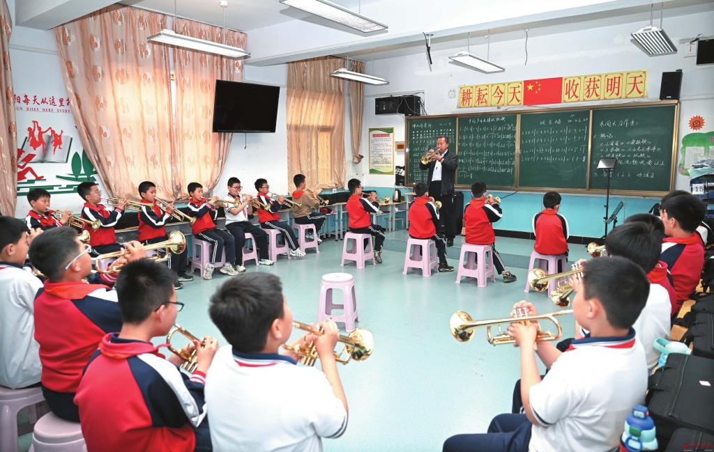 今年以來,五臺縣實(shí)驗(yàn)小學(xué)科學(xué)推行“基礎(chǔ)+拓展+綜合+特色”多元化教學(xué)教改,并在落實(shí)“雙減”的基礎(chǔ)上,根據(jù)學(xué)生興趣愛好和學(xué)段需求,著力創(chuàng)新藝術(shù)與體育教學(xué)授課模式,成立了美術(shù)、書法、舞蹈、晉劇、演講、架子鼓、電子琴、小號以及球類等19個小社團(tuán),培養(yǎng)學(xué)生的興趣愛好。圖為小號手在排練。(金俊賢 戎敏攝)