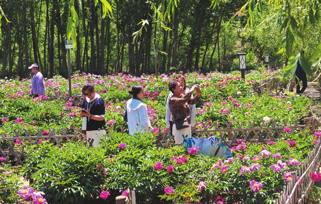 6月3日,原平市大龍門牡丹芍藥山莊天藍(lán)云白,山清水秀,魚躍蛙鳴,牡丹花、芍藥花競(jìng)相綻放,成為八方賓客暢游之地。圖為游客正在盡情欣賞牡丹花、芍藥花之美。褚震攝