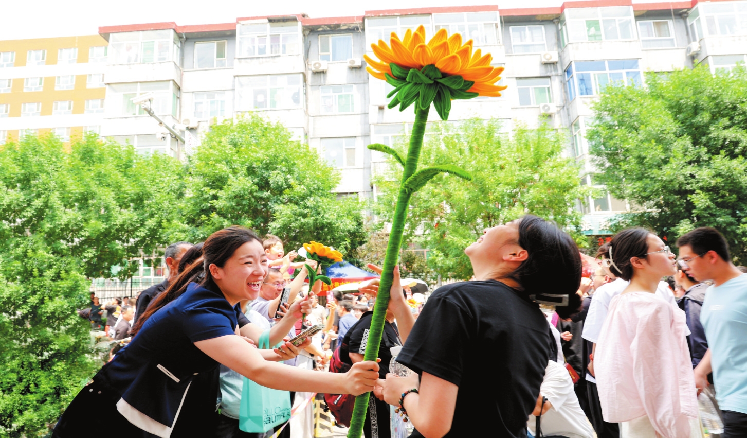 圖為忻州七中考場外,一名考生的姐姐在妹妹走出考場時(shí)送上一朵特大號(hào)向日葵,祝妹妹“一舉奪魁”。范琛攝