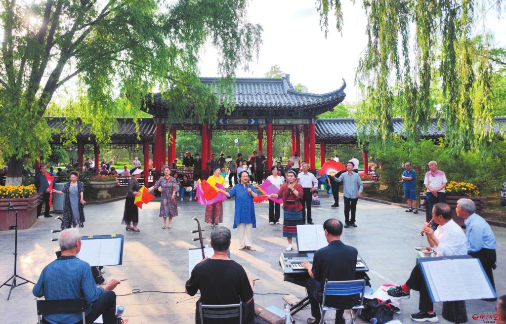 6月9日,在忻州城區(qū)人民公園,老年音樂愛好者們正一展歌喉,吸引不少市民圍觀。(記者張存良攝)