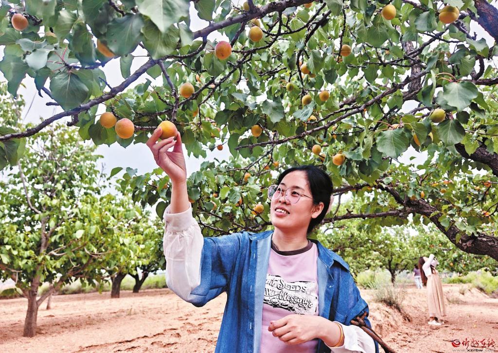 游客采摘大杏。褚震攝