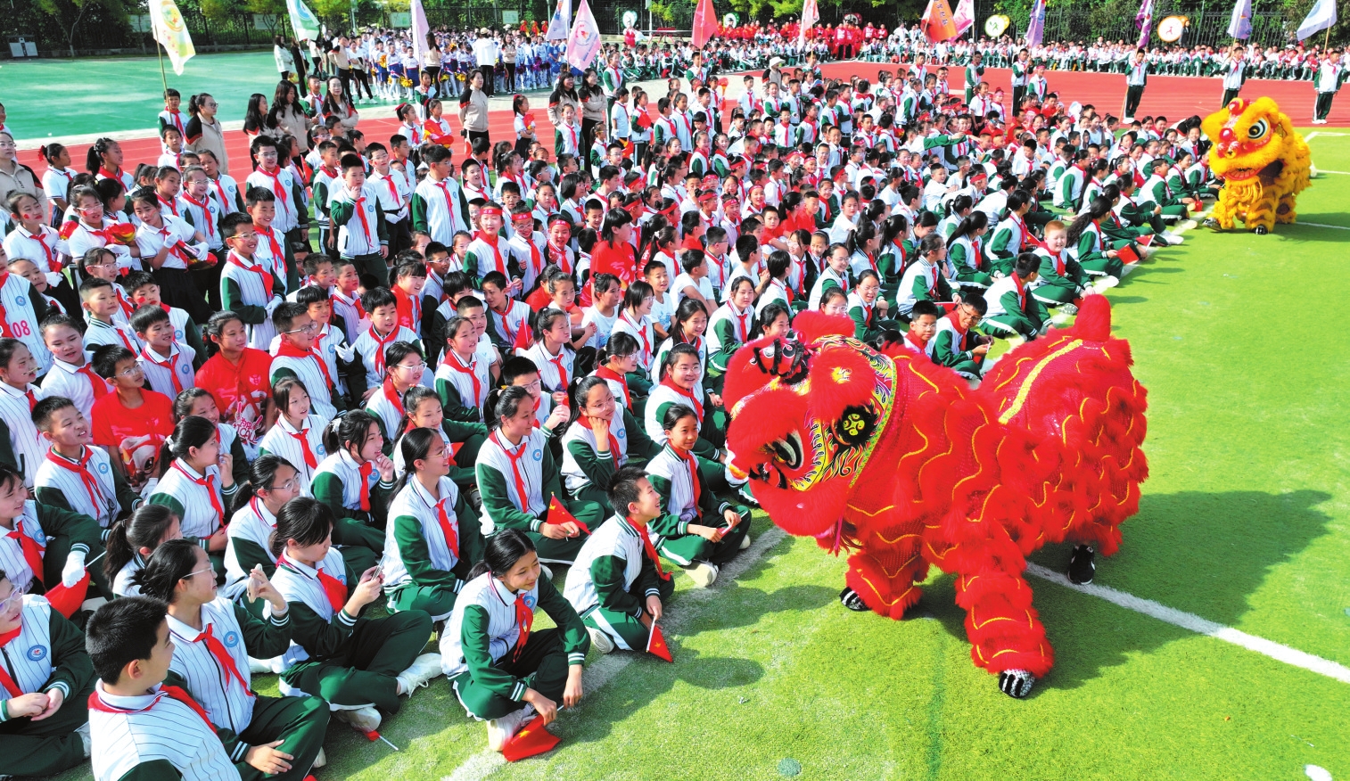 9月28日,忻州市長征小學(xué)西校區(qū)舉行第二屆秋季田徑運動會。圖為開幕式上孩子們與“獅”互動。(