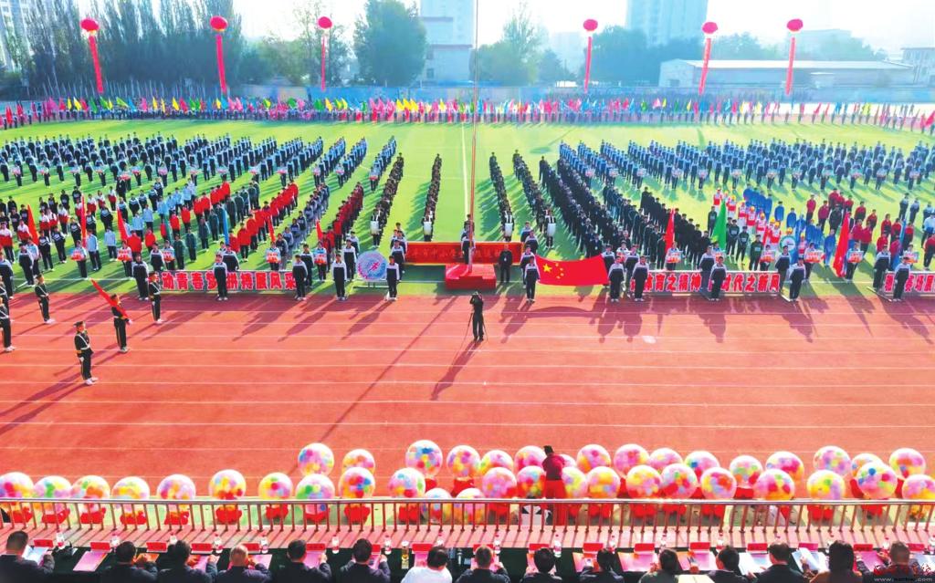 9月28日,原平市范亭中學(xué)校運(yùn)動(dòng)場(chǎng)上彩旗招展、鼓樂喧天,該市中小學(xué)秋季田徑運(yùn)動(dòng)會(huì)開幕,有小學(xué)、初中、高中的38支代表隊(duì)共3000余人參加了開幕式。圖為開幕式現(xiàn)場(chǎng)。(吉建平攝)