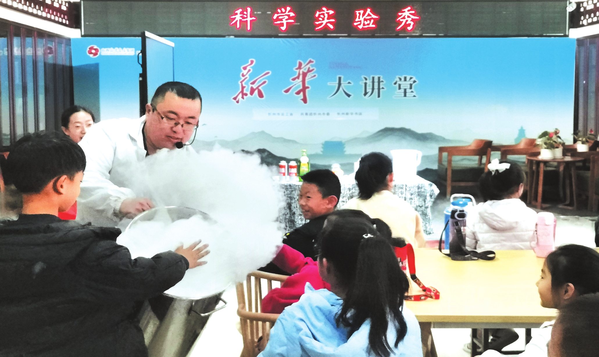 近日,在市圖書大廈“騰云駕霧”科學實驗秀上,小朋友興奮地觸摸了“白云”。由市總工會、共青團忻州市委主辦,忻州新華書店協(xié)辦,每周一次的“新華大講堂”深受小朋友歡迎。(本報記者宮清華攝)