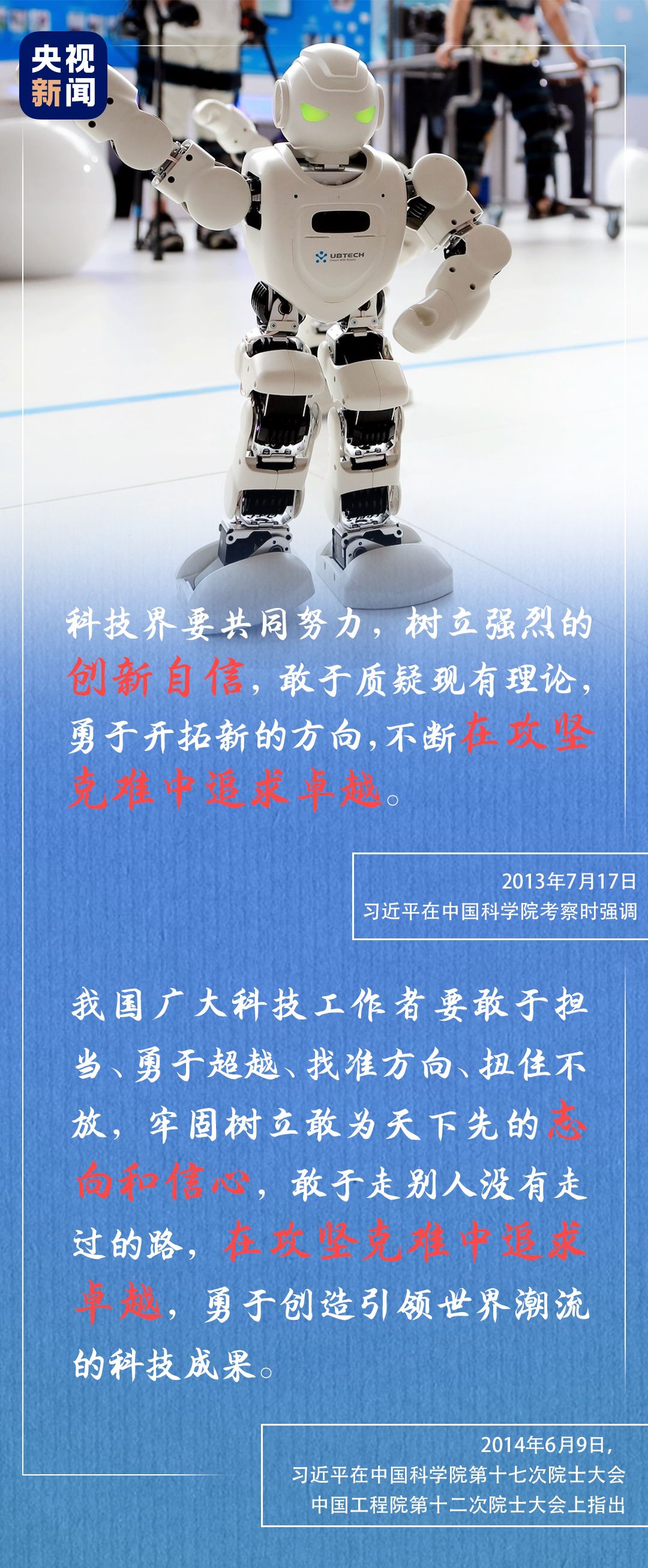 2013年3月4日,習(xí)近平在參加全國政協(xié)十二屆一次會議的科協(xié)、科技界委員聯(lián)組會討論時指出,在日趨激烈的全球綜合國力競爭中,我們必須“走自主創(chuàng)新道路,采取更加積極有效的應(yīng)對措施,在涉及未來的重點科技領(lǐng)域超前部署、大膽探索,加快從要素驅(qū)動發(fā)展為主向創(chuàng)新驅(qū)動發(fā)展轉(zhuǎn)變,發(fā)揮科技創(chuàng)新的支撐引領(lǐng)作用”。 今年5月26日,在出席十三屆全國人大三次會議解放軍和武警部隊代表團(tuán)全體會議時,習(xí)近平要求堅持向科技創(chuàng)新要戰(zhàn)斗力,加強(qiáng)國防科技創(chuàng)新特別是自主創(chuàng)新、原始創(chuàng)新。 “創(chuàng)新從來都是九死一生”,習(xí)近平總書記勉勵我國廣大科技工作者要有強(qiáng)烈的創(chuàng)新信心和決心,要有“亦余心之所善兮,雖九死其猶未悔”的豪情,勇于攻堅克難、追求卓越、贏得勝利,積極搶占科技競爭和未來發(fā)展制高點。