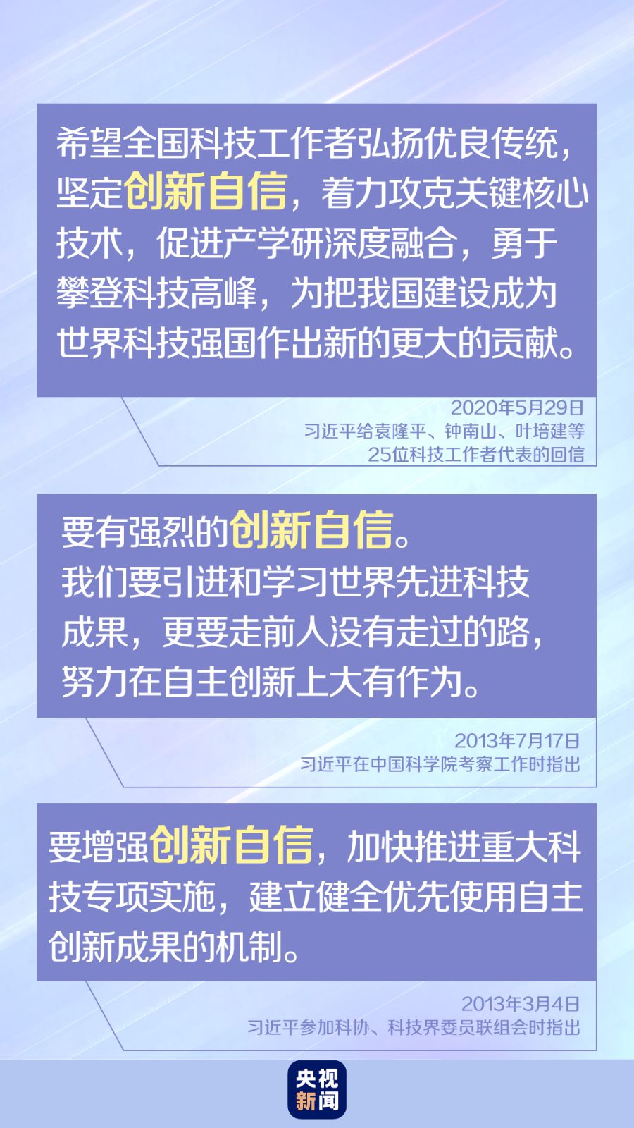 2013年7月17日,習(xí)近平總書記在考察中國科學(xué)院時發(fā)表重要講話,強(qiáng)調(diào)科技界要共同努力,樹立強(qiáng)烈的創(chuàng)新自信,敢于質(zhì)疑現(xiàn)有理論,勇于開拓新的方向,不斷在攻堅克難中追求卓越。 今年“全國科技工作者日”到來之際,習(xí)近平給25位科技工作者代表回信,再次強(qiáng)調(diào)“堅定創(chuàng)新自信”,勉勵廣大科技工作者為把我國建設(shè)成為世界科技強(qiáng)國作出新的更大的貢獻(xiàn)。 科學(xué)技術(shù)從來沒有像今天這樣深刻影響著國家前途命運(yùn),從來沒有像今天這樣深刻影響著人民生活福祉。尤其是今年決勝全面建成小康社會、決戰(zhàn)脫貧攻堅,突如其來的新冠肺炎疫情給我們完成既定目標(biāo)任務(wù)帶來挑戰(zhàn),我們比以往任何時候都更加需要堅定的創(chuàng)新自信。