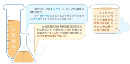 利用核酸檢測開展大范圍篩查,是精準(zhǔn)防控疫情的有效手段。省衛(wèi)健委醫(yī)政醫(yī)管局四級調(diào)研員趙宏介紹,全省開展新冠病毒核酸檢測的醫(yī)療機(jī)構(gòu)從最初的14所增加到174所,日最大檢測量達(dá)到7.4萬人份,平均報(bào)告時限縮短至6小時,最短只需2個半小時。