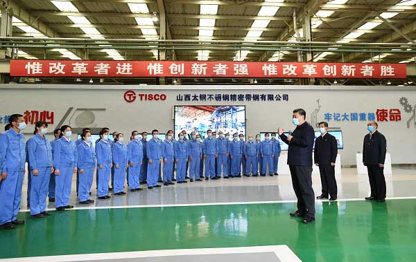2020年5月11日至12日,中共中央總書(shū)記、國(guó)家主席、中央軍委主席習(xí)近平在山西考察。這是5月12日上午,習(xí)近平在太鋼不銹鋼精密帶鋼有限公司生產(chǎn)車間考察時(shí),同企業(yè)職工親切交流。 新華社記者 謝環(huán)馳攝