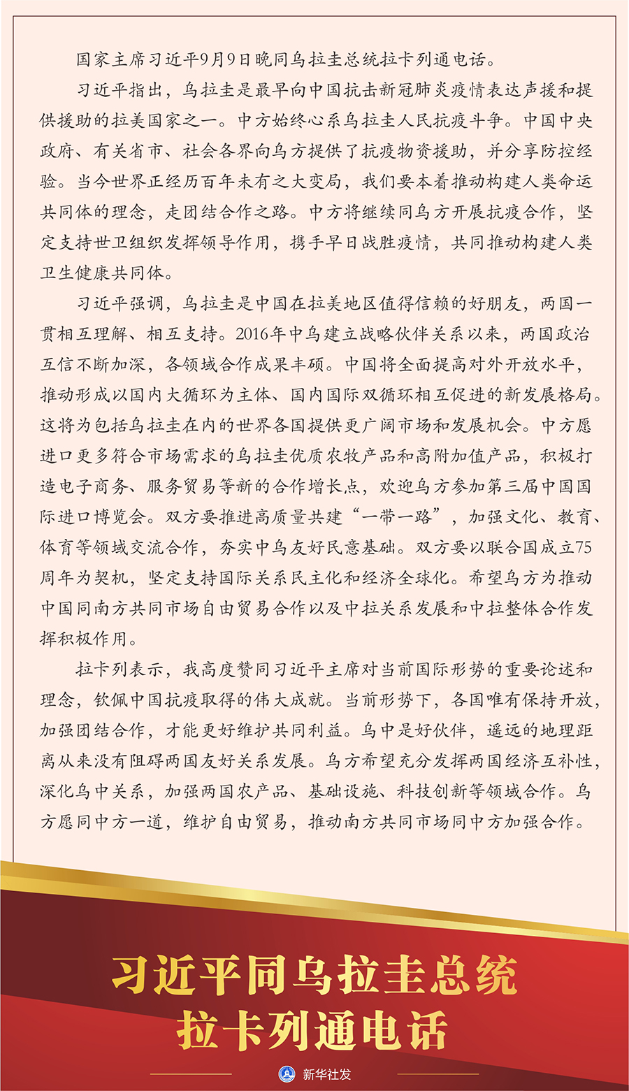新華社北京9月9日電 國家主席習近平9月9日晚同烏拉圭總統(tǒng)拉卡列通電話。
