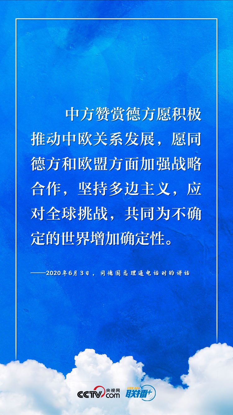 9月14日,習(xí)近平主席將以視頻方式同德國總理默克爾、歐洲理事會主席米歇爾、歐盟委員會主席馮德萊恩共同舉行中德歐領(lǐng)導(dǎo)人會晤?!堵?lián)播+》梳理今年以來習(xí)近平主席與德國、歐盟領(lǐng)導(dǎo)人“云外交”的部分講話,與您共同感受團結(jié)合作中蘊藏的深遠意義。