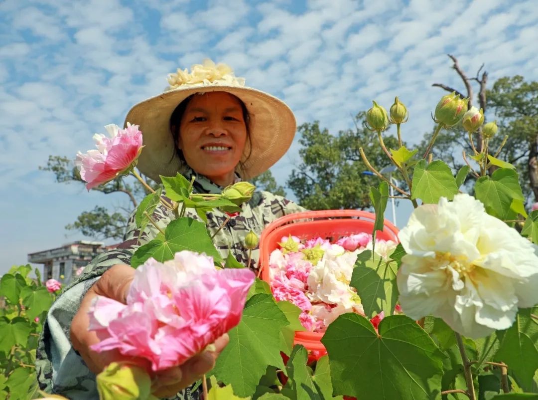 △2019年11月11日,江西省吉安市泰和縣灌溪鎮(zhèn)田心村農(nóng)民正搶抓晴好天氣采摘芙蓉花。