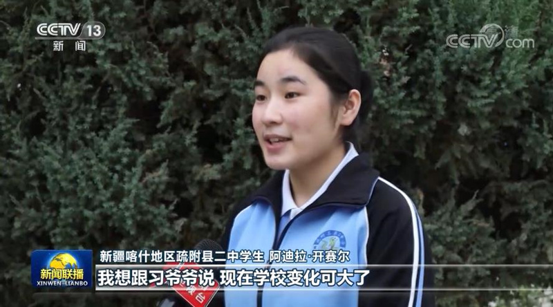 從設施到扶貧,從醫(yī)療到教育,發(fā)生在新疆的變化各族人民感同身受。疏附縣二中學生阿迪拉告訴記者,2014年4月,習近平總書記來學校看望師生,還跟大家合了影。站在總書記右手邊的就是阿迪拉,現在她已經是一名高中生了。