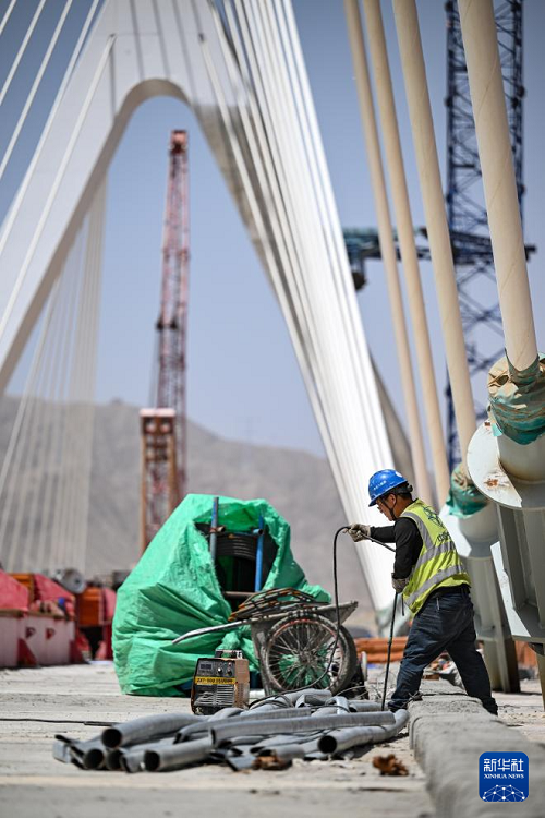 7月3日,工人在黑山峽黃河特大橋建設(shè)現(xiàn)場施工作業(yè)。(新華社記者 馮開華 攝)