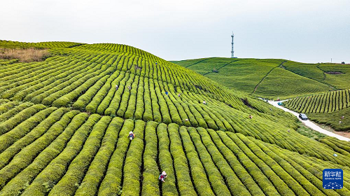 茶農在貴州省安順市西秀區(qū)雙堡鎮(zhèn)山京茶場采茶(2025年4月4日攝,無人機照片)。(新華社記者 陶亮 攝)