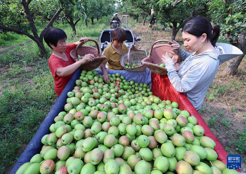 7月8日,河北省趙縣范莊鎮(zhèn)秀才營村果農(nóng)在梨園采摘鮮梨。(新華社記者 楊世堯 攝)