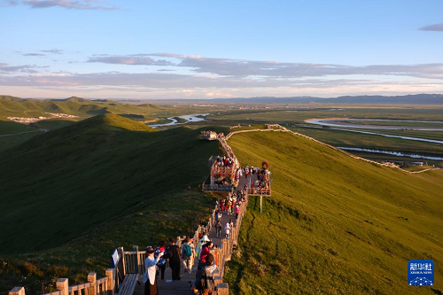 7月12日,游客行走在若爾蓋九曲黃河第一灣景區(qū)棧道上。(新華社記者 張雅雯 攝)