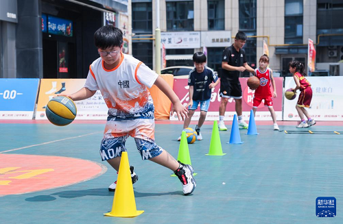 7月15日,在諸暨市悅朗新天地廣場,籃球教練帶領(lǐng)孩子們進(jìn)行投籃、運(yùn)球等基本訓(xùn)練。(新華社記者 徐昱 攝)