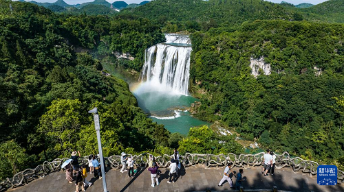 7月16日,游客在貴州省安順市黃果樹瀑布景區(qū)游覽(無人機照片)。(新華社記者 陶亮 攝)