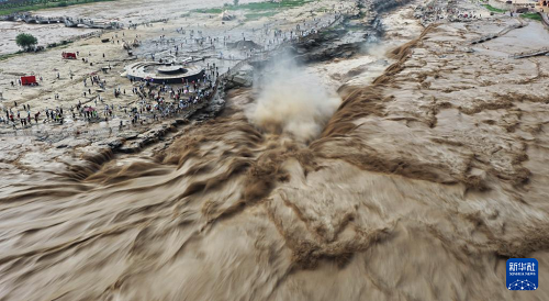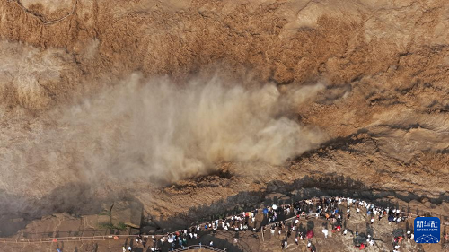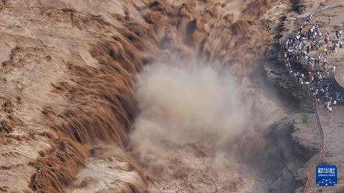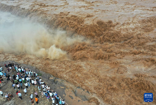 7月27日,人們?cè)谏轿骷h觀看黃河壺口瀑布(無(wú)人機(jī)照片)。(新華社發(fā) 劉宏達(dá) 攝)