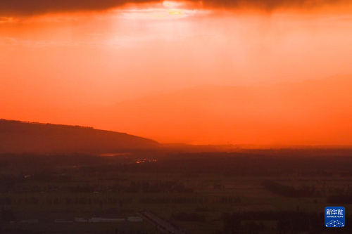 這是8月3日在那拉提草原拍攝的晚霞(無人機(jī)照片)。(新華社記者 辛悅衛(wèi) 攝)