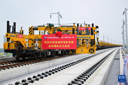 8月6日,在淮宿蚌城際鐵路鋪軌施工現(xiàn)場(chǎng),中鐵一局施工人員將首對(duì)500米長(zhǎng)鋼軌鋪設(shè)在無(wú)砟軌道上,這標(biāo)志著淮宿蚌城際鐵路全線(xiàn)開(kāi)始鋪軌。