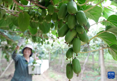 8月12日,果農(nóng)在河北省盧龍縣劉田各莊鎮(zhèn)張?zhí)锔髑f村軟棗獼猴桃種植基地采摘軟棗獼猴桃。(新華社記者 楊世堯 攝)