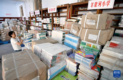 8月14日,河北省石家莊市欒城區(qū)新華書店工作人員在倉庫清點(diǎn)教材。(新華社發(fā) 李明發(fā) 攝)