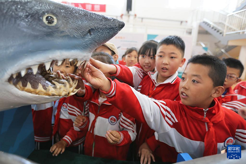9月8日,在甘肅省定西市舉辦的“山海相依,筑夢蔚藍”山東青島·甘肅定西海洋科普東西部協(xié)作主題活動中,定西市安定區(qū)關川實驗學校的學生在觀看海洋生物標本。(新華社發(fā) 王克賢 攝)
