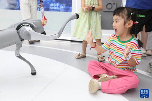 9月7日,在位于江蘇省徐州市云龍區(qū)的一家科學探索館,小朋友與機器狗互動。(新華社發(fā) 蒯創(chuàng) 攝)