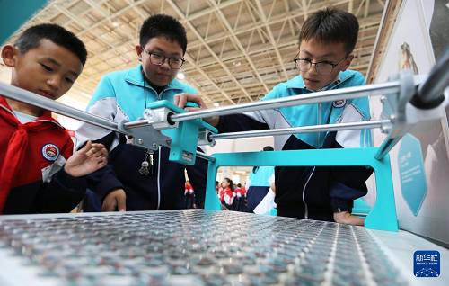 9月8日,在甘肅省定西市舉辦的“山海相依,筑夢蔚藍”山東青島·甘肅定西海洋科普東西部協(xié)作主題活動中,定西市安定區(qū)關川實驗學校的學生在流動科技館內(nèi)體驗科普裝置。(新華社發(fā) 王克賢 攝)
