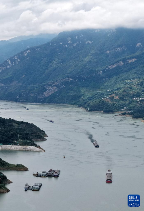 9月11日,船舶行駛在三峽大壩上游的湖北省宜昌市秭歸縣茅坪鎮(zhèn)水域(無人機照片)。(新華社發(fā) 王輝富 攝)