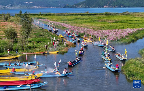 9月16日,當(dāng)?shù)厝罕婑{著豬槽船從瀘沽湖的洛洼北碼頭開(kāi)始轉(zhuǎn)海(無(wú)人機(jī)照片)。(新華社記者 江宏景 攝)