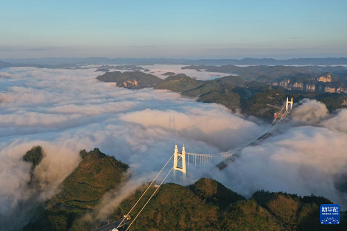 9月16日清晨拍攝的湖南省湘西土家族苗族自治州吉首市矮寨特大懸索橋(無(wú)人機(jī)照片)。(新華社發(fā) 劉振軍 攝)