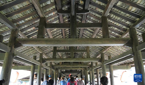 9月25日,游人行走在三江侗族自治縣程陽永濟橋上。(新華社記者 張楓 攝)
