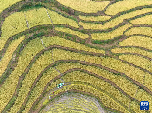 10月10日,湖北省宜昌市秭歸縣沙鎮(zhèn)溪鎮(zhèn)長春村村民駕駛農機在田間收獲水稻(無人機照片)。(新華社發(fā) 雷勇 攝)