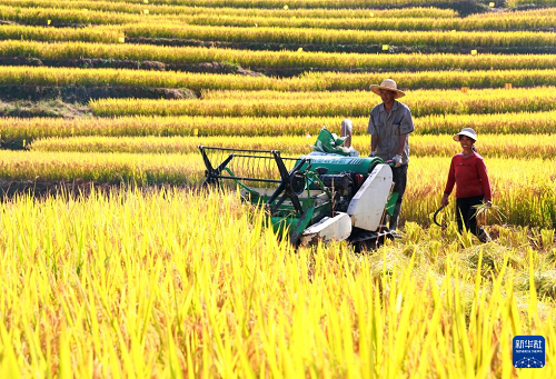 10月10日,湖北省宜昌市秭歸縣沙鎮(zhèn)溪鎮(zhèn)長春村村民駕駛農機在田間收獲水稻。(新華社發(fā) 王罡 攝)