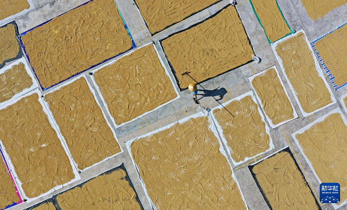 10月10日,浙江省臺州市仙居縣官路鎮(zhèn)增仁村農民在晾曬稻谷(無人機照片)。(新華社發(fā) 王華斌 攝)
