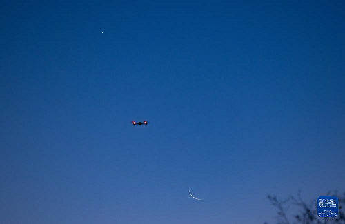 10月20日,在位于黑龍江省黑河市的北大荒集團(tuán)北安分公司趙光農(nóng)場(chǎng)有限公司,攝影愛好者在用無(wú)人機(jī)拍攝啟明星伴月。(新華社發(fā) 錢泊羽 攝)