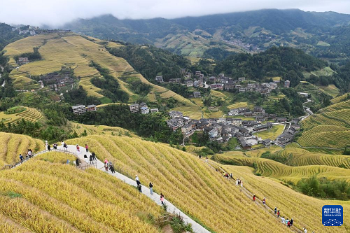眼下,廣西龍勝各族自治縣龍脊梯田一片金黃,成為眾多游客觀光“打卡”的熱門景點。龍脊梯田已有2300多年歷史,是聯(lián)合國糧農(nóng)組織認證的全球重要農(nóng)業(yè)文化遺產(chǎn)。