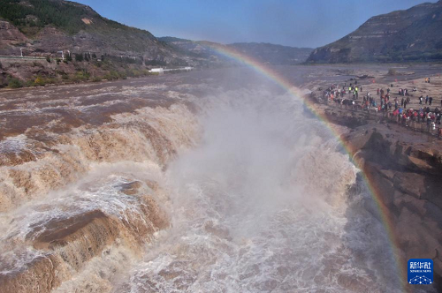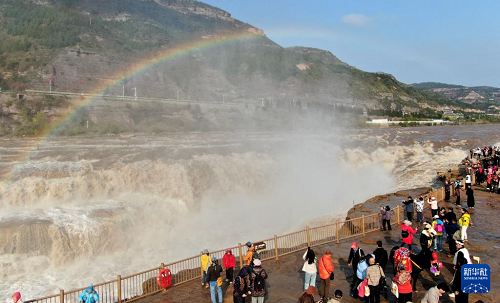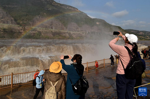 10月27日,游客在山西吉縣黃河壺口瀑布景區(qū)欣賞“彩虹橋”景觀。(新華社發(fā) 呂桂明 攝)
