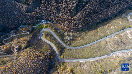 10月26日在位于寧夏固原市隆德縣的寧夏六盤山紅軍長征景區(qū)拍攝的秋景(無人機照片)。(新華社記者 王鵬 攝)