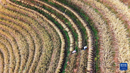 11月5日,龍脊鎮(zhèn)大寨村村民在梯田上收割水稻(無(wú)人機(jī)照片)。(新華社發(fā) 潘志祥 攝)