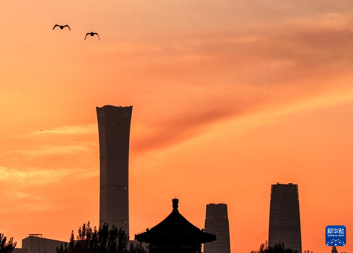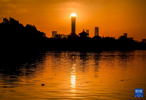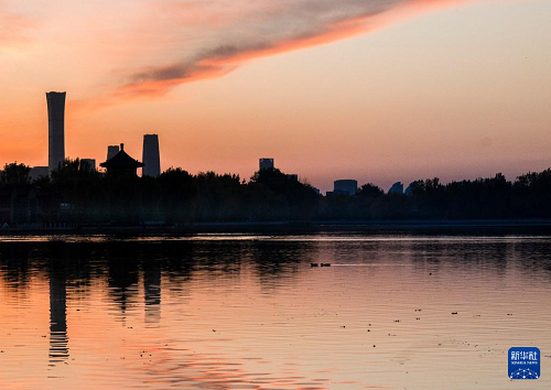 11月10日清晨,北京上空晨曦微露,霞光滿天。中國(guó)尊、望海樓等地標(biāo)建筑在晨光中與什剎海光影交錯(cuò)。