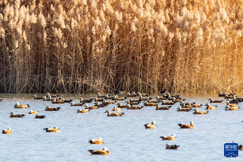 11月12日,赤麻鴨等鳥類在張掖黑河濕地國(guó)家級(jí)自然保護(hù)區(qū)高臺(tái)段一處湖泊休憩覓食。(新華社記者 張智敏 攝)