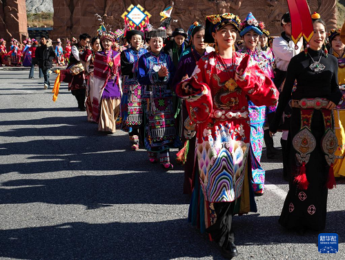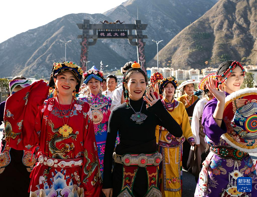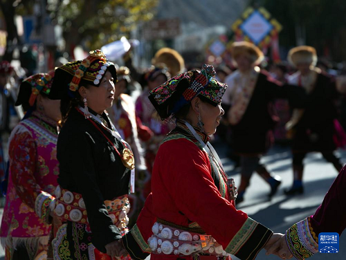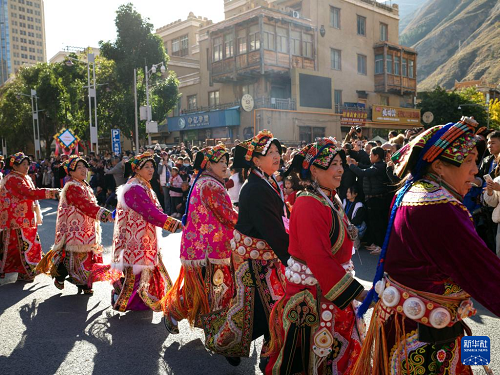 11月19日,在四川省汶川縣城,身著民族服飾的婦女參加非遺大巡游活動。(新華社發(fā) 蘭紅光 攝)