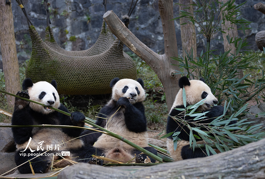 2025年12月1日,四川省都江堰市中國(guó)大熊貓保護(hù)研究中心都江堰青城山基地,大熊貓享用美食、嬉戲玩耍,憨態(tài)可掬,惹人喜愛(ài)。陳先林?jǐn)z(人民圖片網(wǎng))